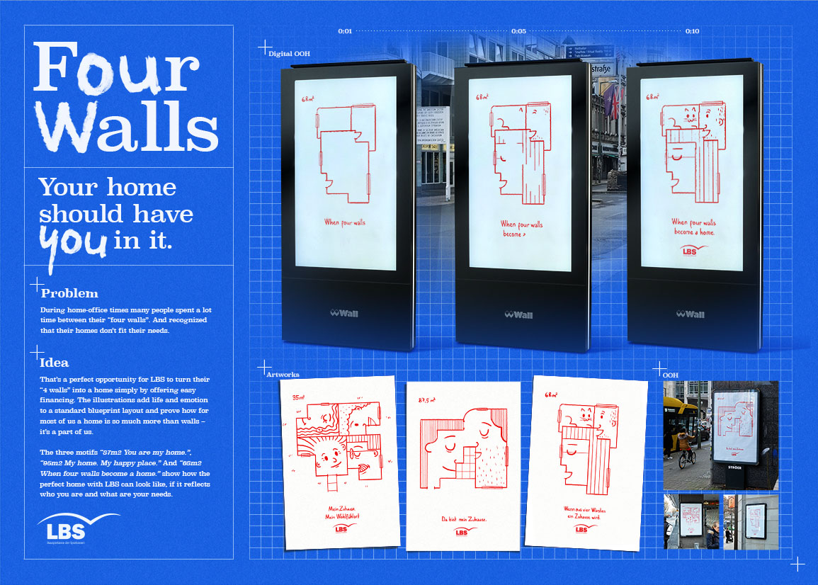 Throughout my involvement with the LBS (Landesbausparkasse) brand, I have contributed to various design aspects, including the creation of a comprehensive design guideline and the development of social media, digital, and print assets. Notably, I had the opportunity to work on the “Four Walls” campaign, which was recognised by “Reddot desig awards”, “ADC” and “iF Design Award.” The campaign was also featured in the esteemed “Lürzer’s Archive” in 2022. As the designer, I played a key role in crafting captivating motions for the campaign and producing the case film.