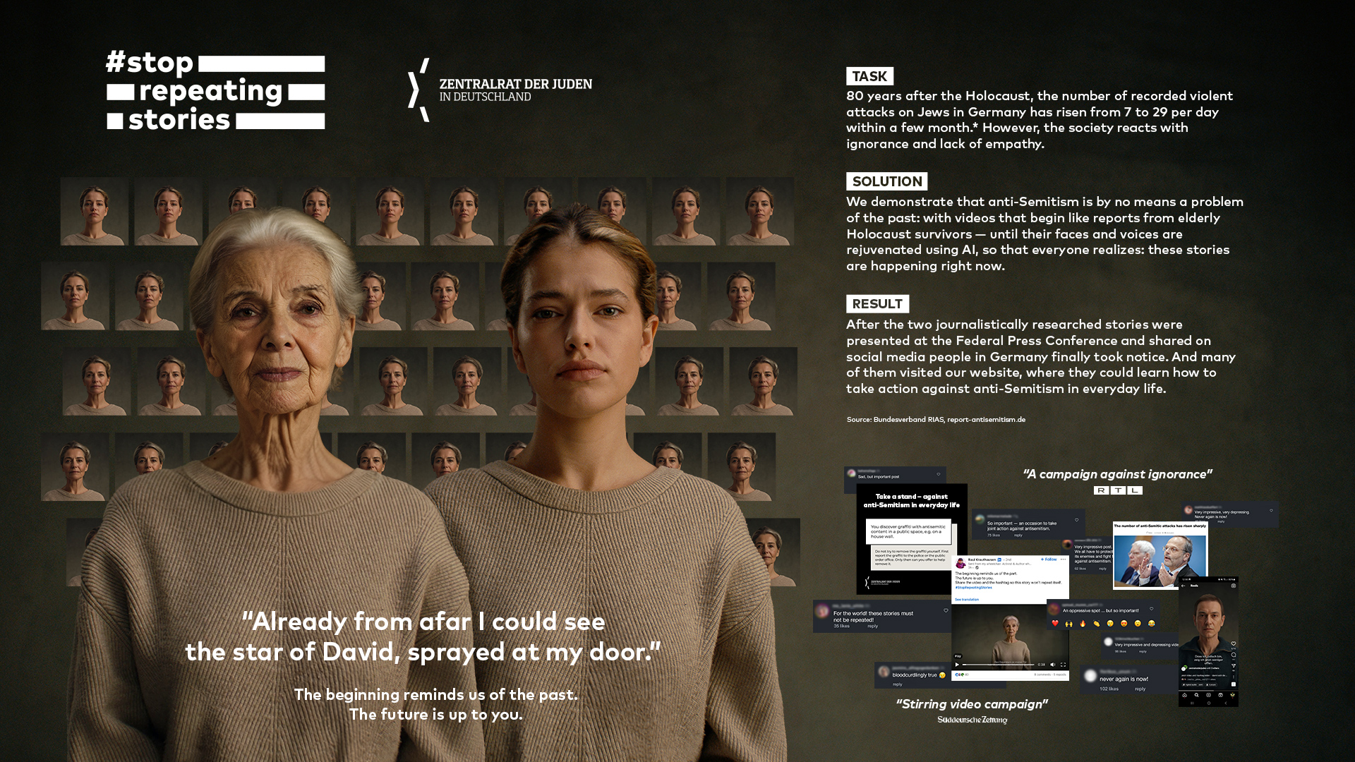 Agency: Serviceplan Client: Zntralrat der Juden in Deutschland Managing director: Jeannette Bohné General manager: Michael Johne Creative Director Copy: Benjamin Baum Head of design: Maxim Weinstein Copywriter: Anna-Lena Simon Art director: Arash Sabbagh Strategy Consultant: Tasha Schedler AI team: Kevin Prösel, Ferdinand Leopold Lotz, Alexander Nagel, Tony Nitschke, Christoph Struber, Sebastian Weidner, Aminah Folli, Tim Stickelbrucks January 2024