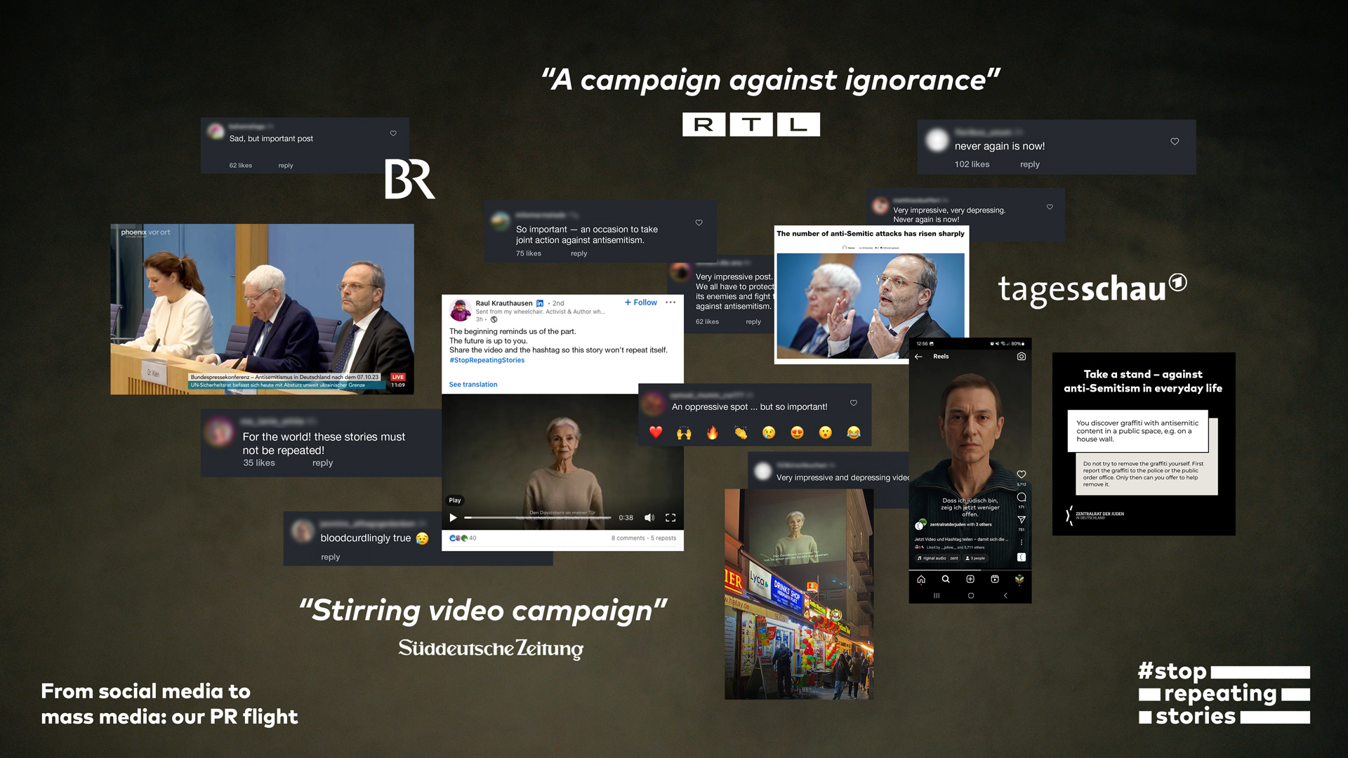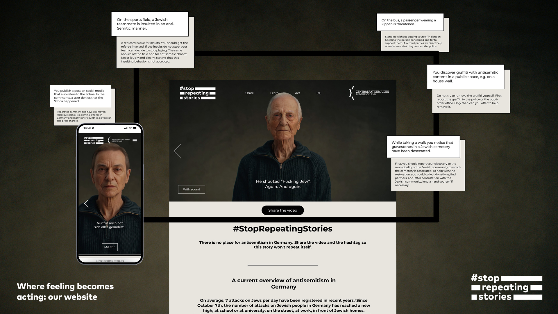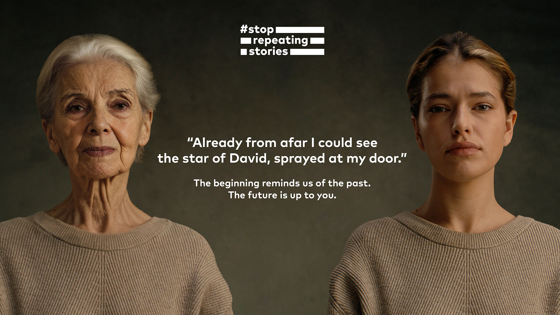 We demonstrate that anti-Semitism is by no means a problem of the past: with videos that begin like reports from elderly Holocaust survivors — until their faces and voices are rejuvenated using AI, so that everyone realizes: these stories are happening right now.
